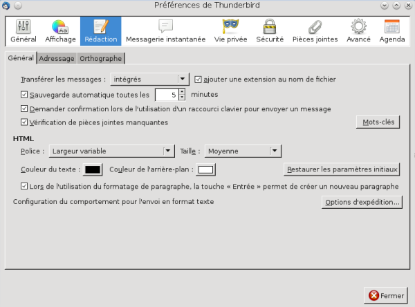 Pour cela dans Thunderbird, aller dans le menu [ Edition ] en haut à gauche, puis [ Préférences ] en bas du menu. Il y a alors en bas à droite du cadre un bouton [ Options d'expédition ].